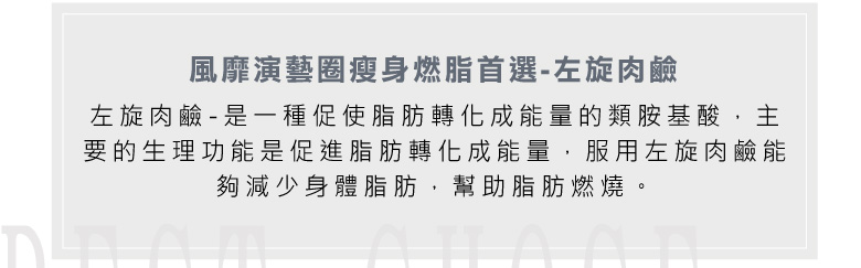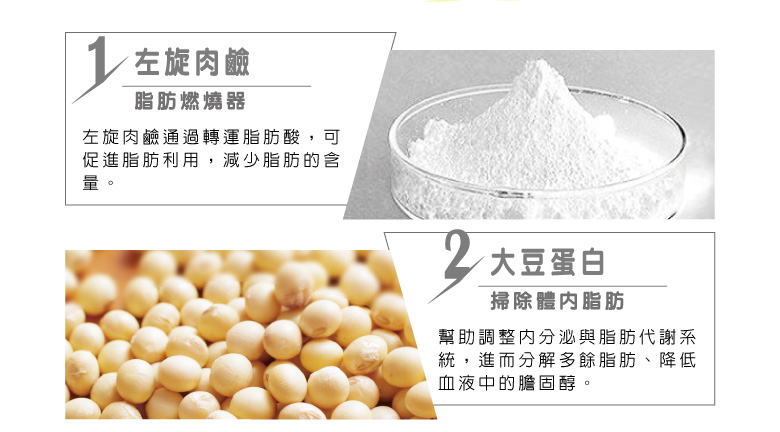 成 分:大豆蛋白萃取物(含苯丙胺酸、纈胺酸、蘇胺酸、色胺酸、異亮胺酸、亮胺酸、甲硫胺酸、精胺酸、離胺酸、組胺酸)、L-肉酸、武靴葉、紅花籽萃取(含CLA共軛亞麻油酸)、麥芽糊精