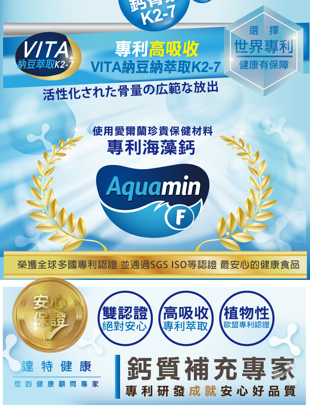 ◆主要成份:  專利愛爾蘭海藻鈣、碳酸鈣、DHA(微藻萃取)、Vita專利納豆菌發酵物K2-7、愛爾蘭海洋鎂、硬脂酸鎂、超微奈米珍珠粉、綜合維生素礦物質(含維生素A、D3、E、C、B1、B2、B6、B12、菸鹼酸、葉酸、泛酸、生物素、鈣、銅、碘、鐵、鎂、鋅、磷)